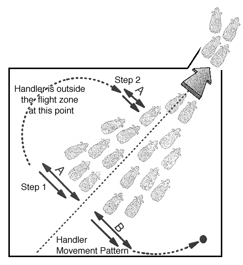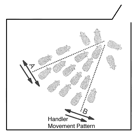 gate, handler A moves near the gate to control animal movement out the gate.